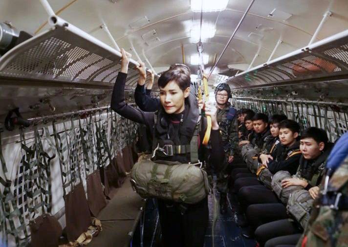 But she is also pictured in the cockpit of a fighter jet and wearing a grey camouflage pattern crop-top at the controls of a light aircraft. Some pictures show Sineenat and the king holding hands while one shows them both in green combat fatigues with the royal pet dog.