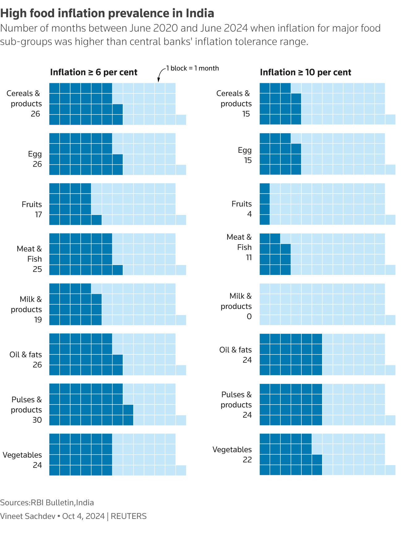 Price increases have been particularly persistent in vegetables, a category that has seen inflation of over 10 per cent in 22 months in the past four years, according to the central bank study. Pulses and oils have experienced double-digit inflation for 24 months and eggs for 15 months over this period.