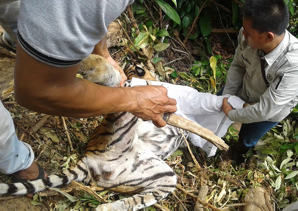 Locals told the conservation agency that a female Sumatran tiger had been seen on Tuesday caught in a pig trap set by a hunter in Muara Lembu village of Riau province.