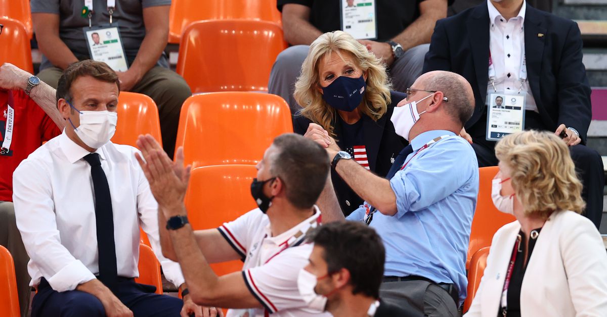 First lady Jill Biden cheered her countrywomen to an upset victory over the French in the debut of 3x3 basketball at the Olympics as President Emmanuel Macron watched on from the sidelines.