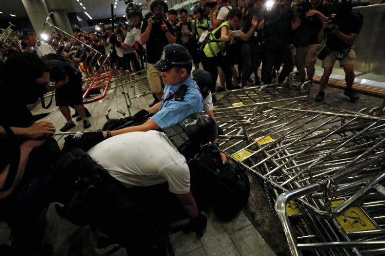 The scenes were reminiscent of 2014 when police used tear gas to disperse pro-democracy demonstrators outside the same building, sparking public anger and setting off two months of demonstrations that took over key intersections of the international finance hub.