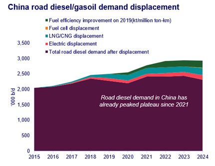 This trend is borne out by diesel demand for road transport expected to fall from 2.3 million b/d in 2023 to 0.7 b/d by 2025.
