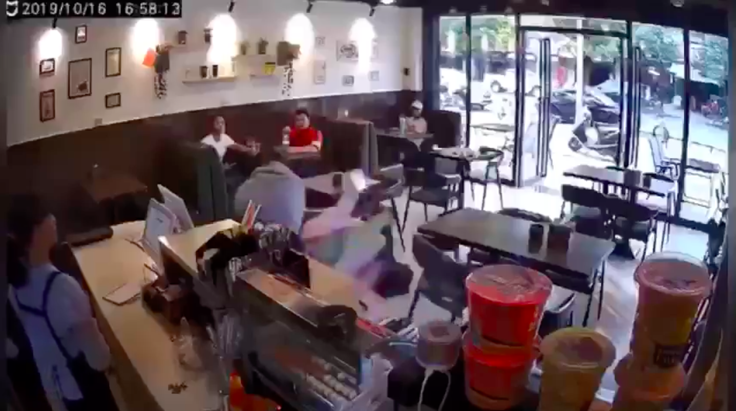 The attacker then stomped on the victim once, took a black container from a nearby table and threw it towards the victim before exiting the cafe.