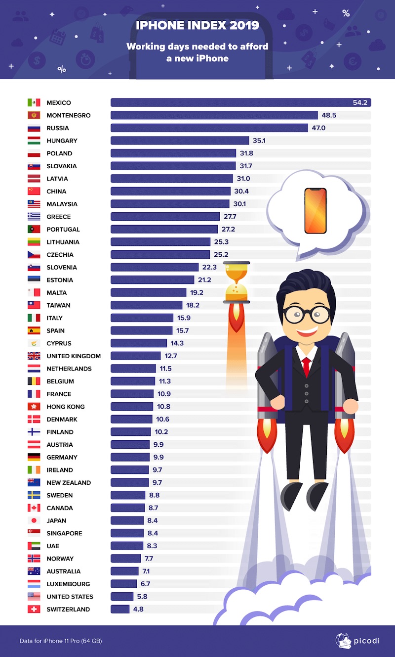 On the other end of the spectrum, the Swiss, Americans, Luxembourgers and Australians will have a much easier time getting their hands on the latest Apple gizmo, statistically speaking. A statistical Swiss should be able to save up for an iPhone 11 Pro in 4.8 days, while it’s 5.8 days for an American, and 6.7 days for a Luxembourger.