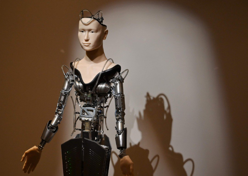Wiring and blinking lights fill the cranial cavity of its open-top head and snake around its gender-neutral, aluminium body.