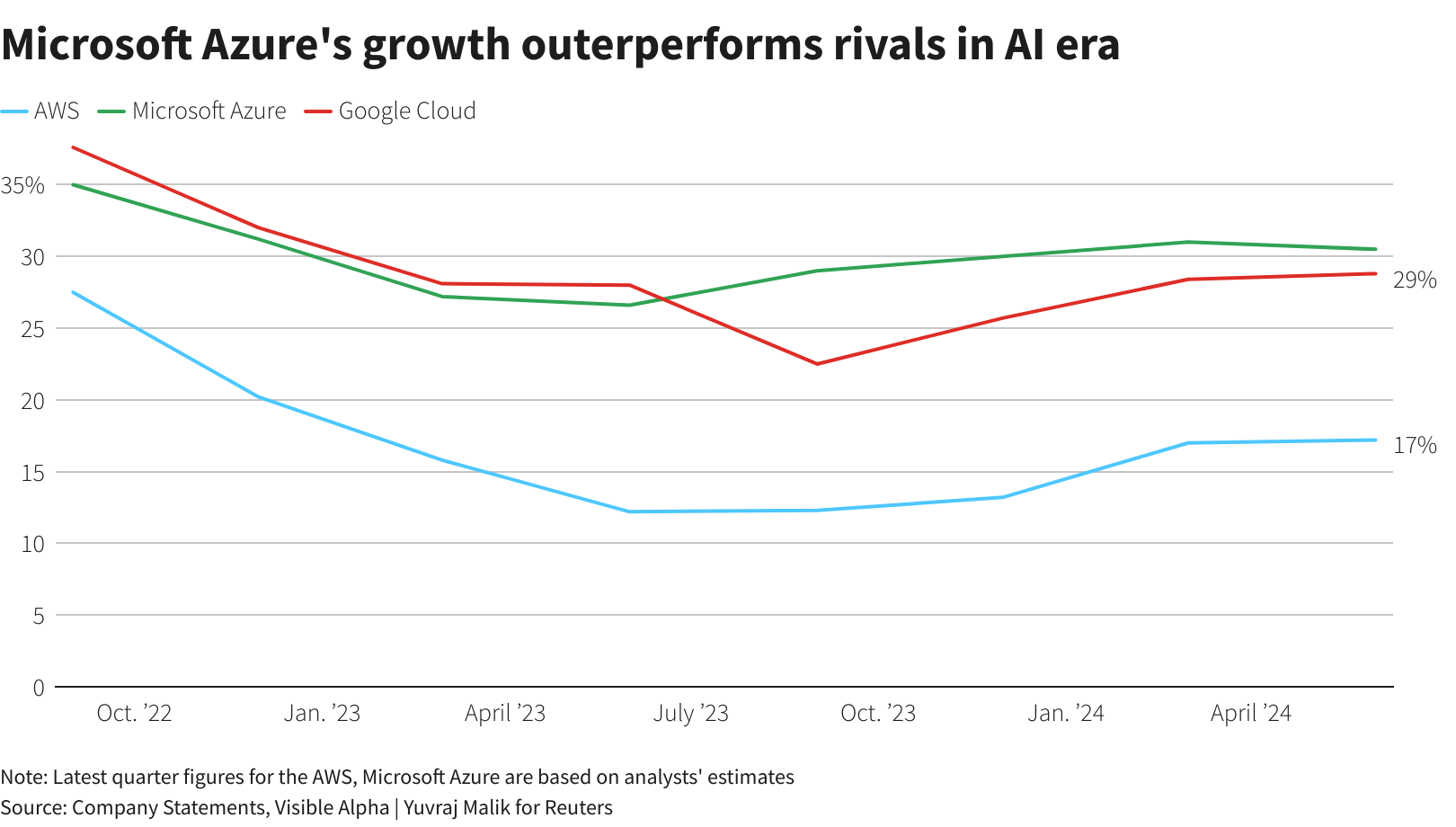 Widely seen as the front-runner in the race to make money from AI, thanks to its tie-up with ChatGPT maker OpenAI, Microsoft is expected to report that Azure's growth stayed steady quarter-over-quarter at about 31 per cent between April and June, according to data from Visible Alpha.