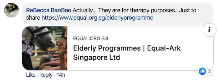 Another commenter pointed out that it could be part of a horse-based therapy programme by local charity Equal Ark. According to the organisation, equine-assisted learning helps develop social-emotional skills among people, including the elderly with clinical depression and dementia.