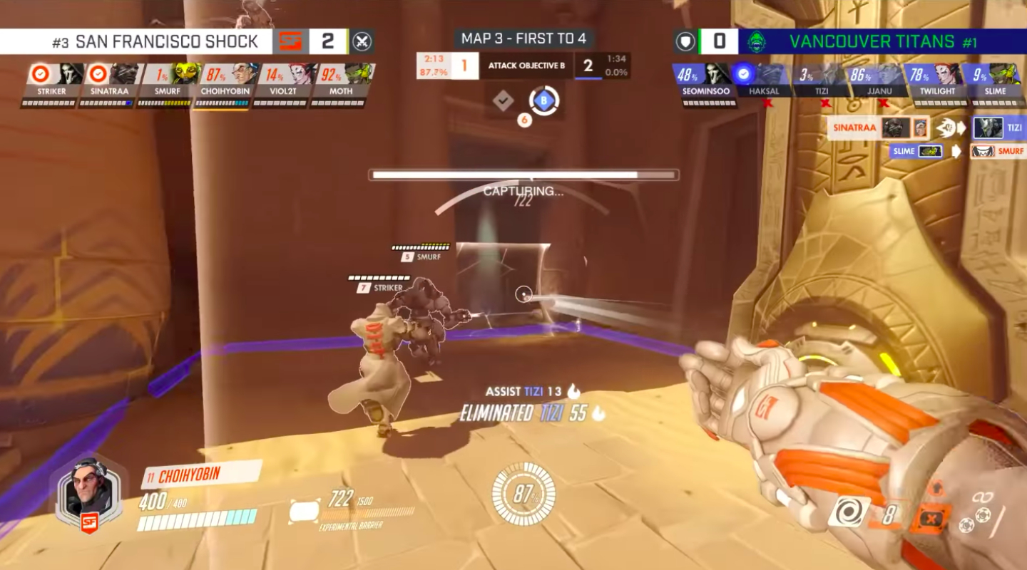 The next game took place on Eichenwalde, and this is where the Sigma-Orisa meta really shined. Orisa and Sigma players worked together here, spitting out barriers while Shock's Architect played as Bastion to tear them all down.
