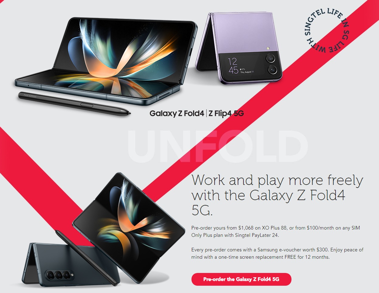 The red camp (Singtel) has the Galaxy Z Flip4 and Galaxy Z Fold4 available via its Singtel XO Plus contract plans.
