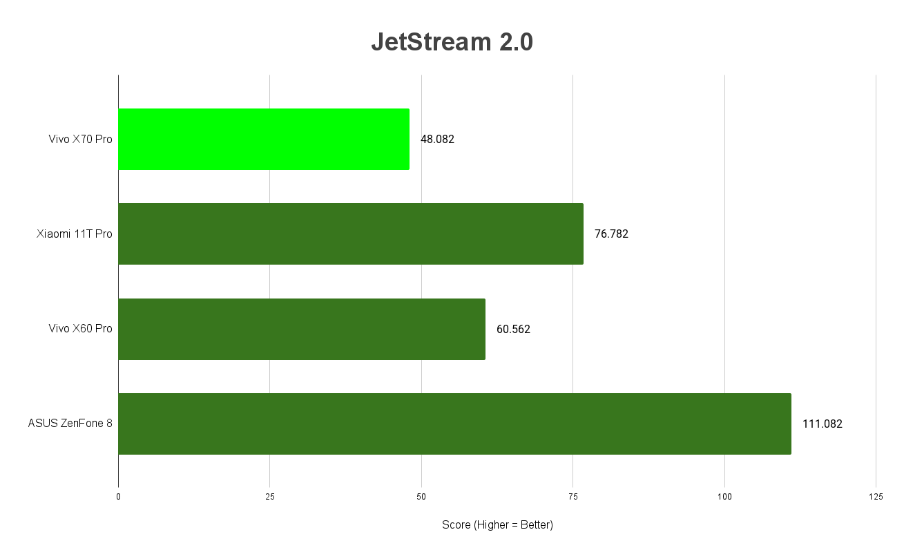 JetStream 2 is a combination of a variety of JavaScript and Web Assembly benchmarks, including benchmarks that came before, like SunSpider and Octane. It primarily tests for a system’s and browser’s ability in delivering a good web experience. It runs a total of 64 subtests, each weighted equally, with multiple iterations, and takes the geometric mean to compute the overall score.
