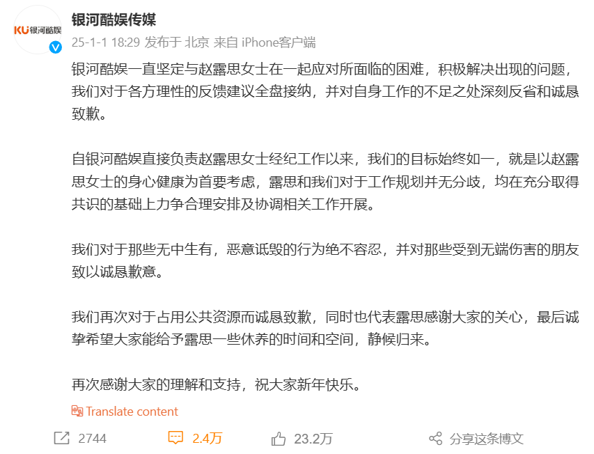 Lusi's management company Galaxy Cool Entertainment also released a statement through a Weibo post yesterday, saying that they have been working with her to deal with the difficulties that she has been facing.