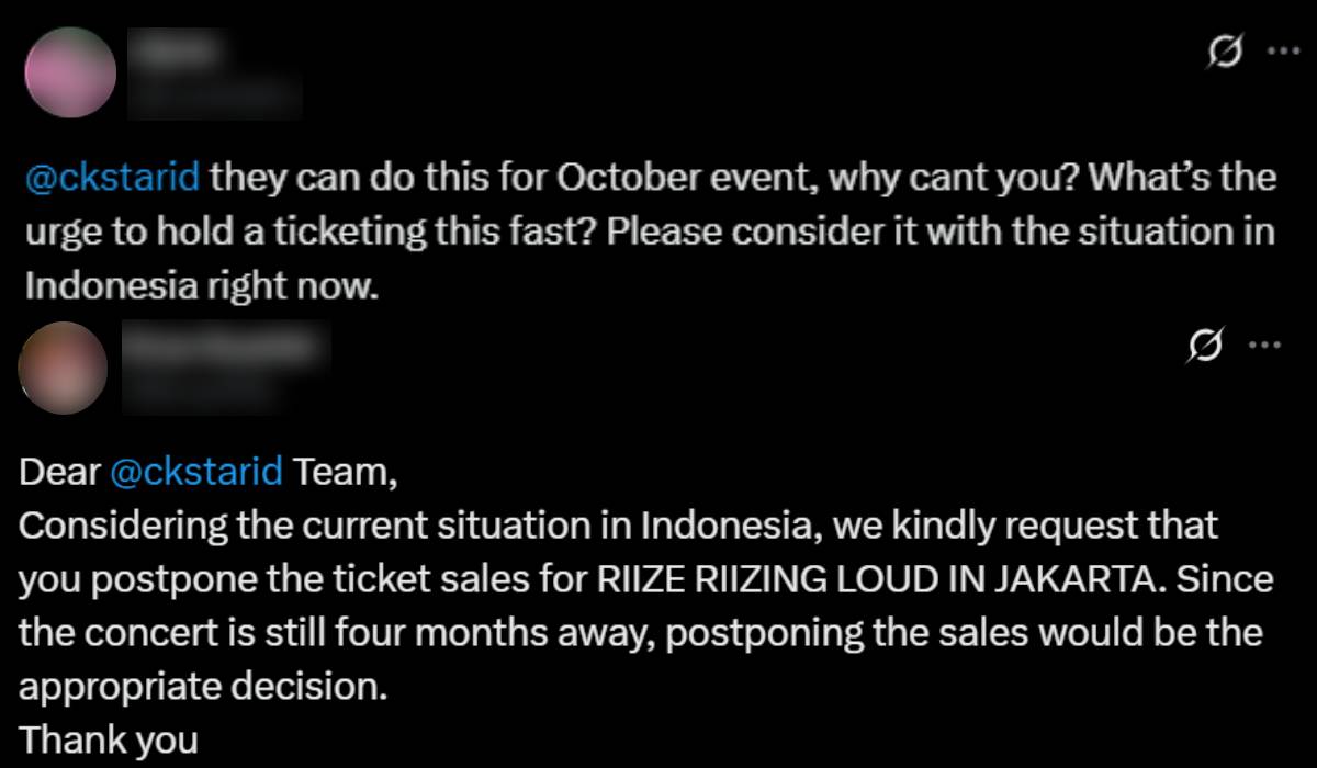 Reposting iMe's statement, a netizen wrote: "CK Star, the ticket sales for Riize should be postponed too. The time until the concert is still a long four months away. Please open your eyes to the current state of the country, consider it with your mind and heart."