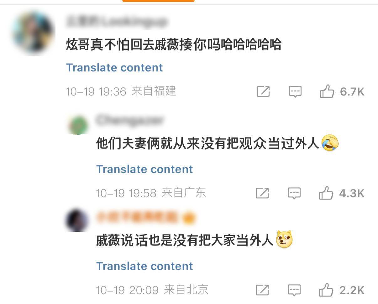 The clip quickly trended on Chinese platform Weibo as netizens joked about how his wife would react and that the couple "never treated the audience as outsiders".