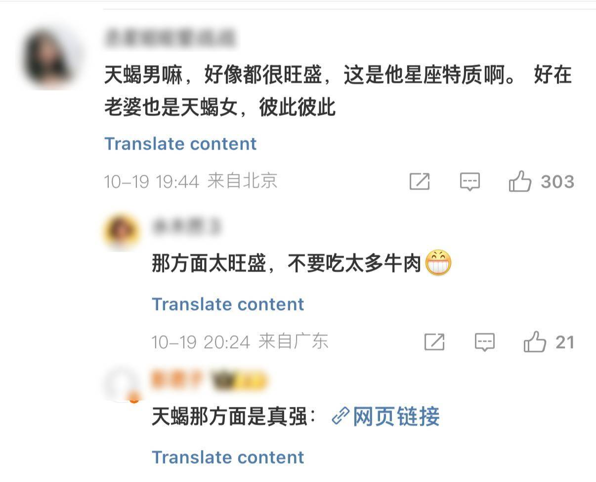 "Scorpio men seem to be very vigorous. Fortunately, his wife is also a Scorpio, so they're the same," said another netizen.