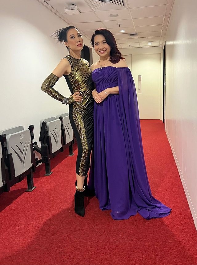 Zoe Tay wore a coral viscose dress from the Tom Ford Pop Art collection with a beaded design on the side that resembled a star… or maybe an explosion.
