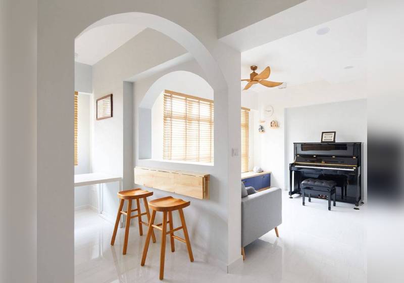 By cutting out an arched window (that mirrors the curved doorway) and incorporating a wall-mounted drop-leaf table and a couple of chairs, the designers turned an otherwise empty wall into a striking breakfast corner.