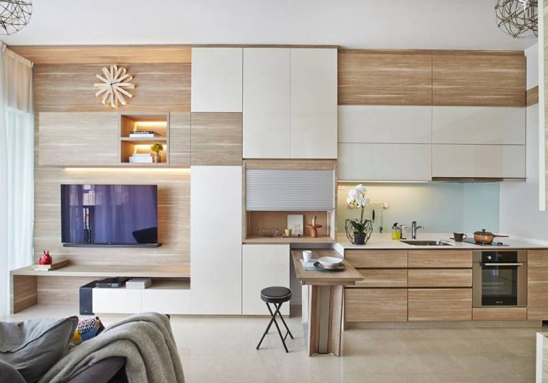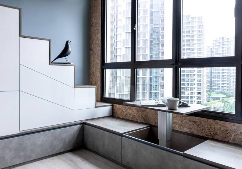 When closed, the table is completely hidden, functioning as extra storage space or seating in the living room.
