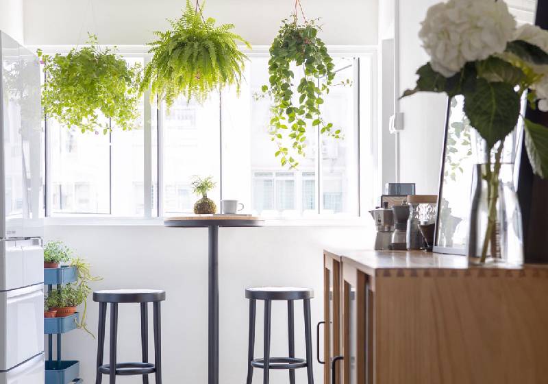 To create a breakfast nook that evokes calm and comfort, surround the eating space with plants.