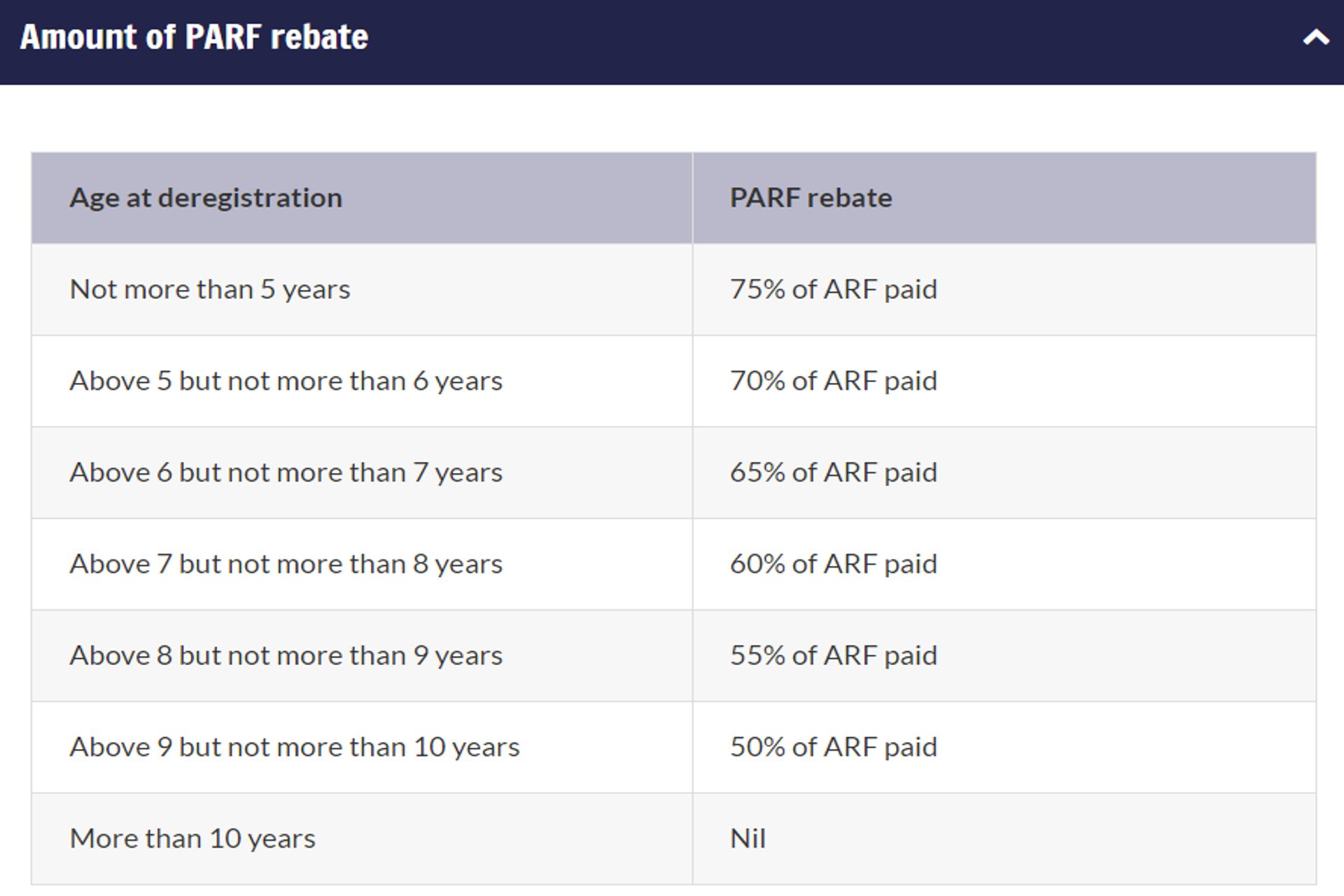 The total PARF rebate you receive depends on the age of your car and the Additional Registration Fee (ARF). A car with less than 5 years of age receives a 75 per cent ARF rebate while a car that has served 9 to less than 10 years in operation will only receive a 50 per cent ARF rebate.