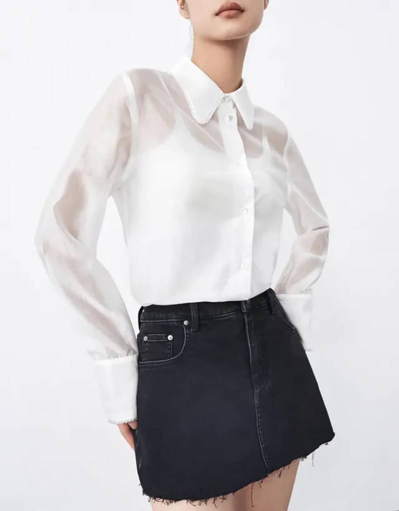 With a sheer see-through organza layer, this white shirt is for those who want to show off some skin without being too overt about it. Denim shorts would add some weight and texture to the ensemble or keep it light and airy with a silk slip skirt.