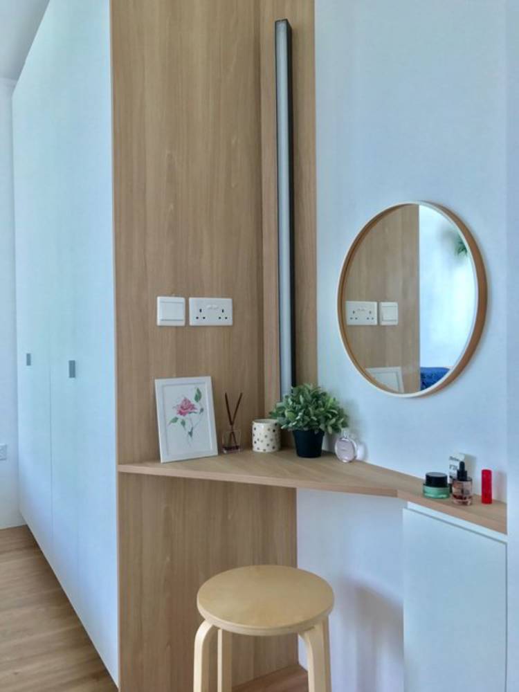 Besides serving as a dresser, this floating vanity table in the bedroom also helps to divide between the sleeping zone and the wardrobe area. Not only does this make for greater privacy, it also helps to reduce disturbance if you have a partner that needs to get up earlier to get ready.