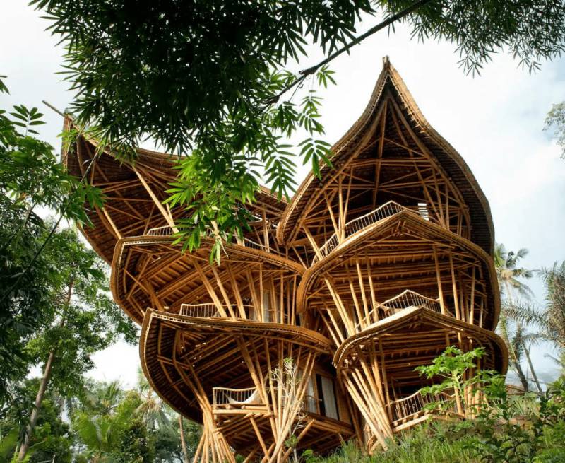 The five-storey house is all about the creative use of bamboo to create a luxurious collection of floors, walls, ceiling, stairs and railings.