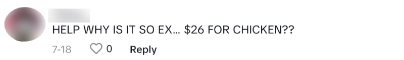 For $26, one would get about 20 chunks of chicken which is "definitely on the higher end [of the price range]". This works out to approximately $1.30 per piece of chicken! Unsurprisingly, this dish received a 6.4 rating.
