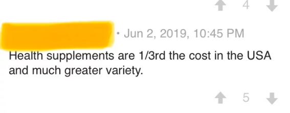 | Health supplements | $60 for 60 probiotic capsules at Guardian | US$20 ($27.37) for 60 capsules on iHerb US |