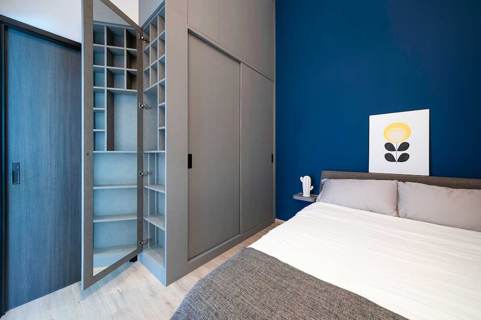 10. Embedded within the built-in wardrobe, this makeup station adopts the similar hue of royal blue and the gold detailing.