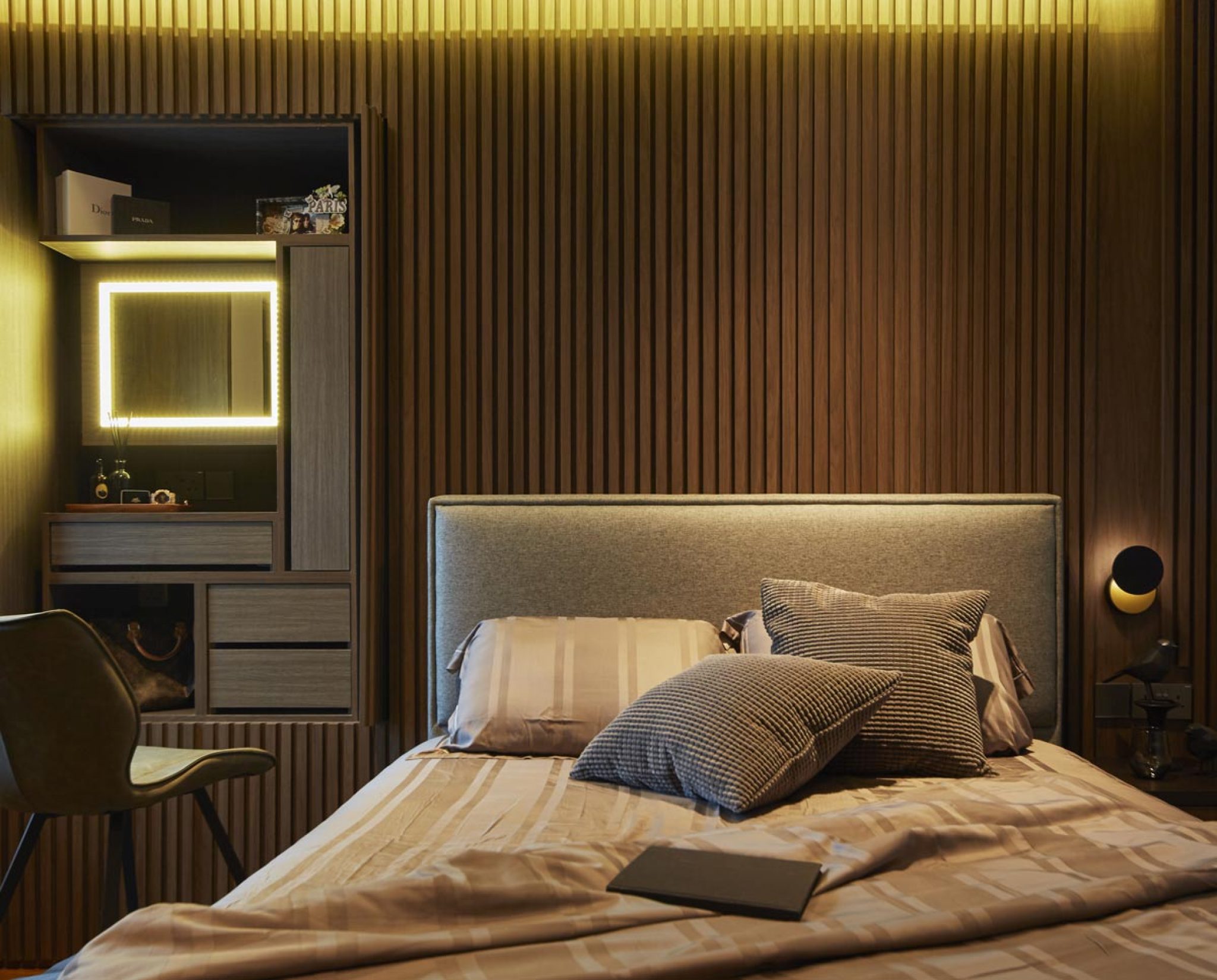 8. Pocket doors designed into the fluted feature wall in this bedroom open up to reveal a hidden vanity station, complete with specially designed drawers for the homeowner’s collection of accessories.