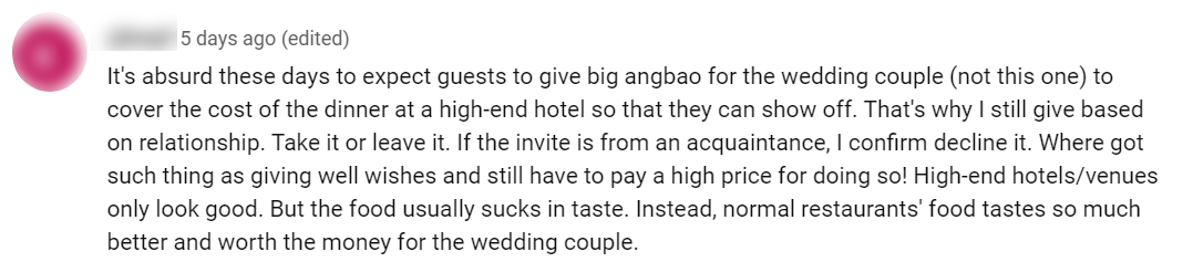 Meanwhile, a different user highlighted that the ang bao amount should be based on the relationship, indicating they would reject an invitation if it came from an acquaintance.