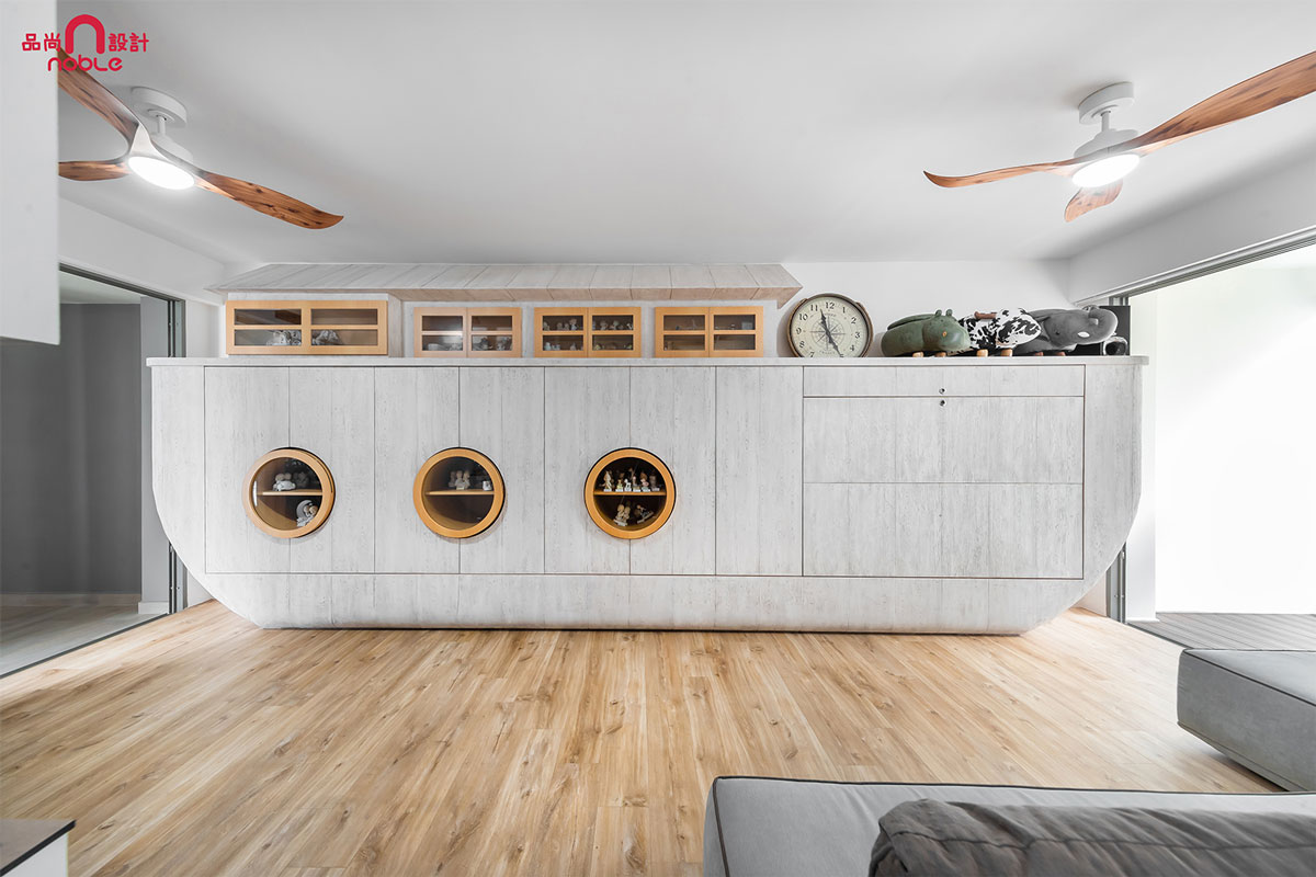 Featuring portholes and an upper deck decked out in stuffed animals and toy figurines, it functions as a TV wall, a display cabinet as well as living room storage.