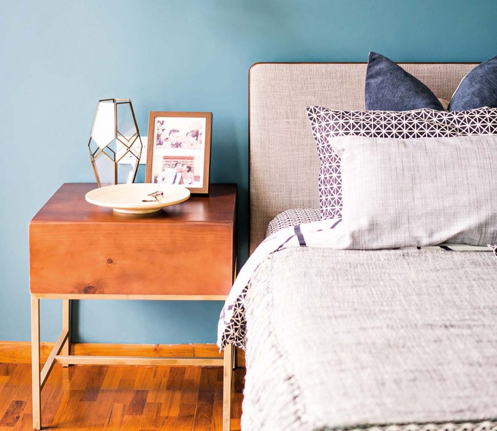 “It’s not so much what you put in the bedroom, but what you keep out of it,” says Joey. As the bedroom is for rest, avoid cluttering the space with too many items. If you’re constantly dealing with a crowded vanity or have too many things next to your bed, consider getting extra storage like a drawer unit on castors.