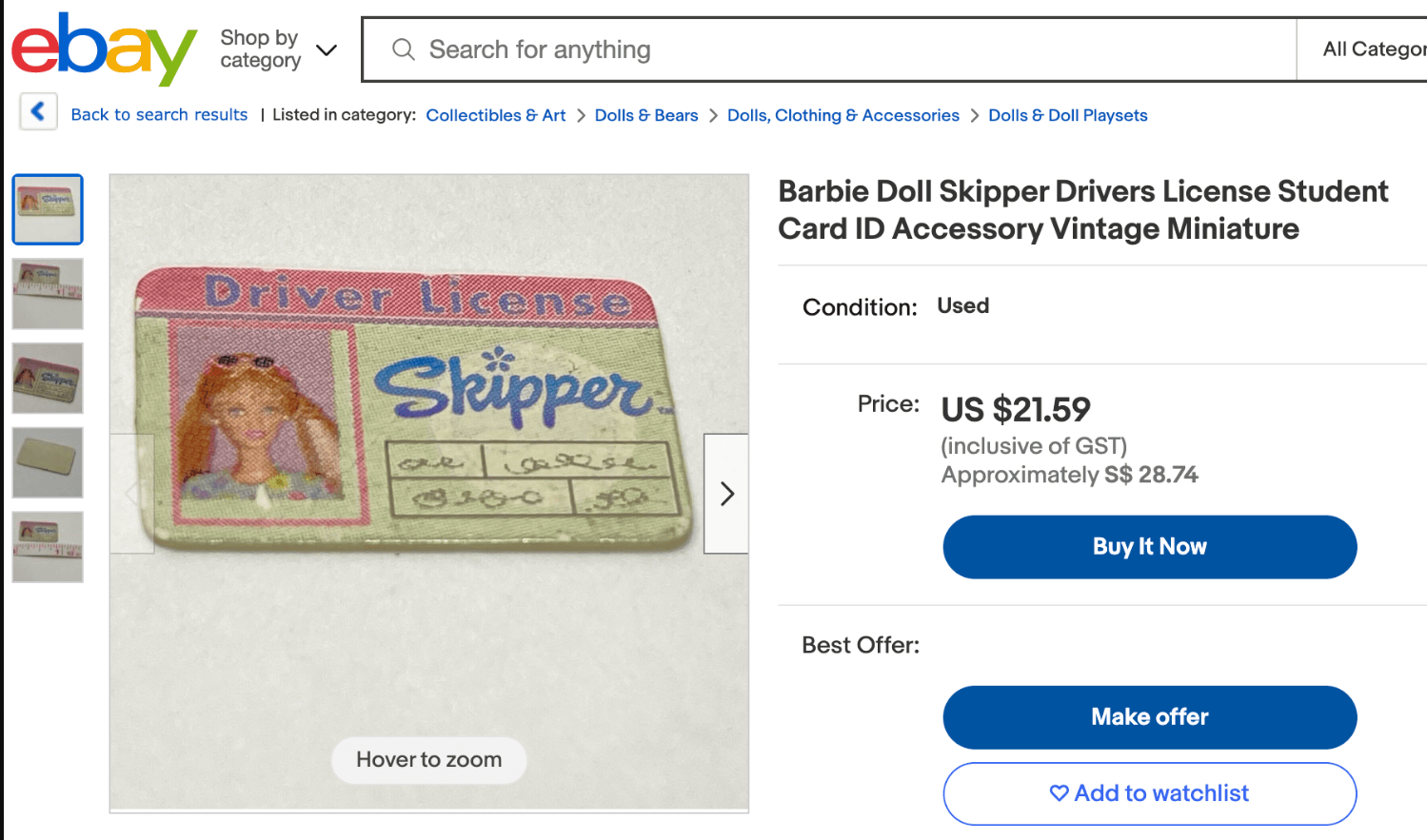 Skipper's driving licence is going for over US$20 on eBay. Yup, that's the discontinued Barbie who grows boobs when you raise her arm.