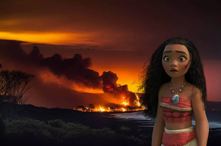 I wanted to bring in pieces that highlight what affects Hawaii. So I did a new piece featuring Moana with the Lāhainā fires behind her, and another with Lilo on the shore as rising waters destroy the homes behind her.