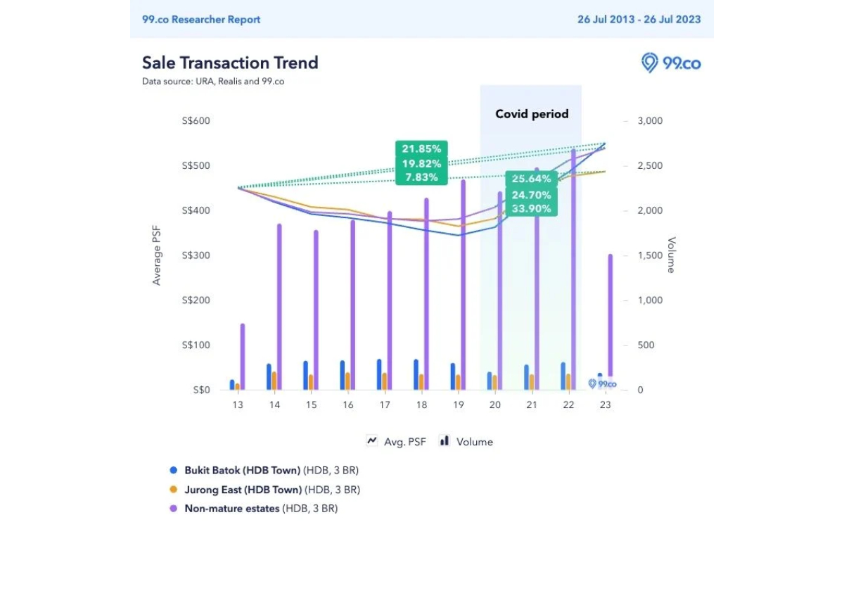 For instance, three-room HDB resale flats in Bukit Batok have recorded a 21.85 per cent increase. It pales in comparison to the price increase for the same flat type in Jurong East (7.83 per cent).