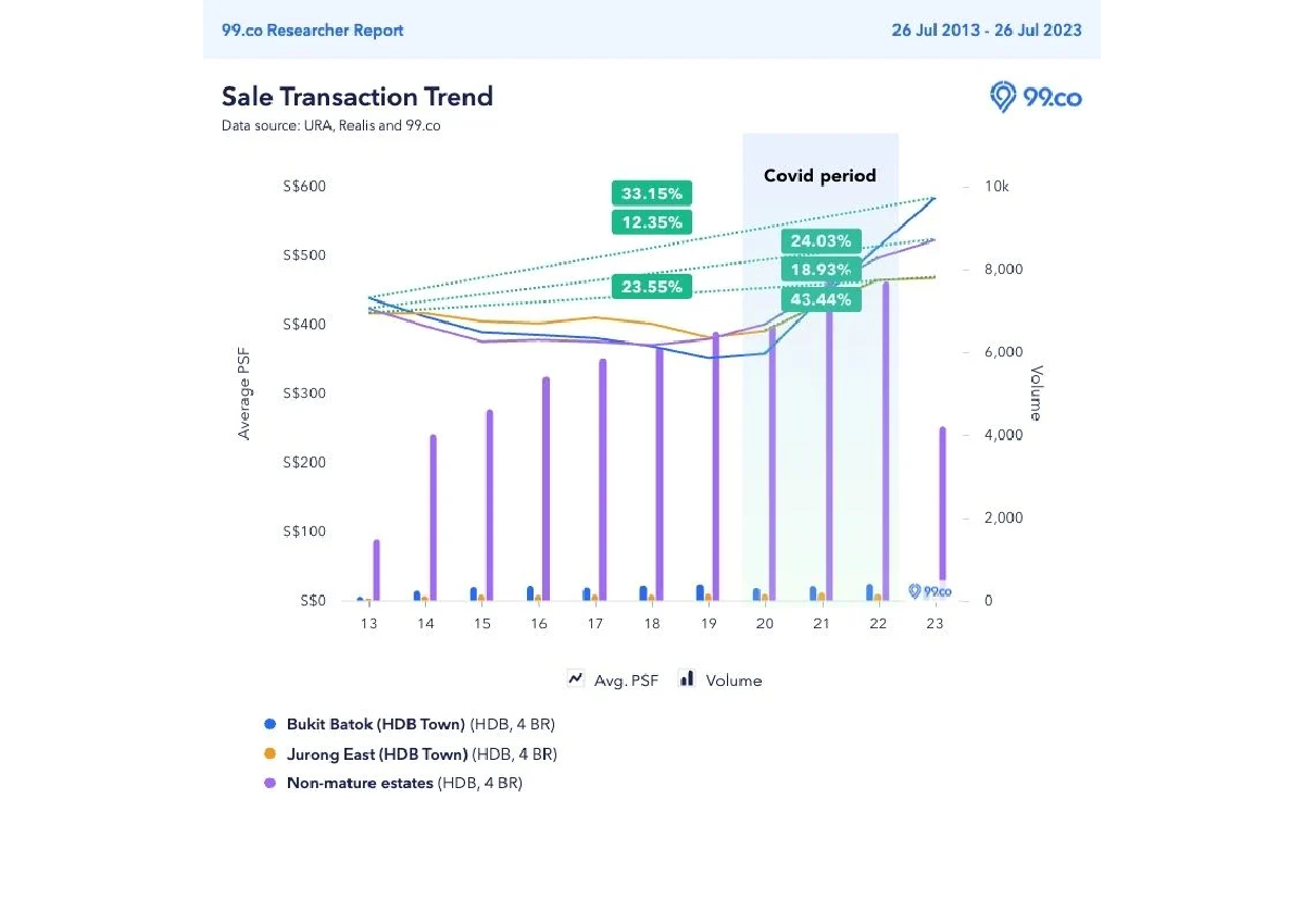 The price growth is even more significant for four-room HDB resale flats in both estates, with prices up by 33.15 per cent for Bukit Batok and 12.35 per cent for Jurong East. The price increase was also very steep between 2020 and 2022, at 43.44 per cent for Bukit Batok and 18.93 per cent for Jurong East.