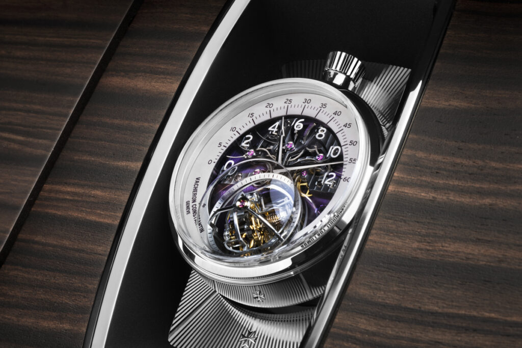 In the case of the Amethyst Droptail, the patron has seen fit to affix a Vacheron Constantin Les Cabinotiers Armillary Tourbillon into the dashboard - set in a white gold base-plate with a hand-carved guilloche motif.
