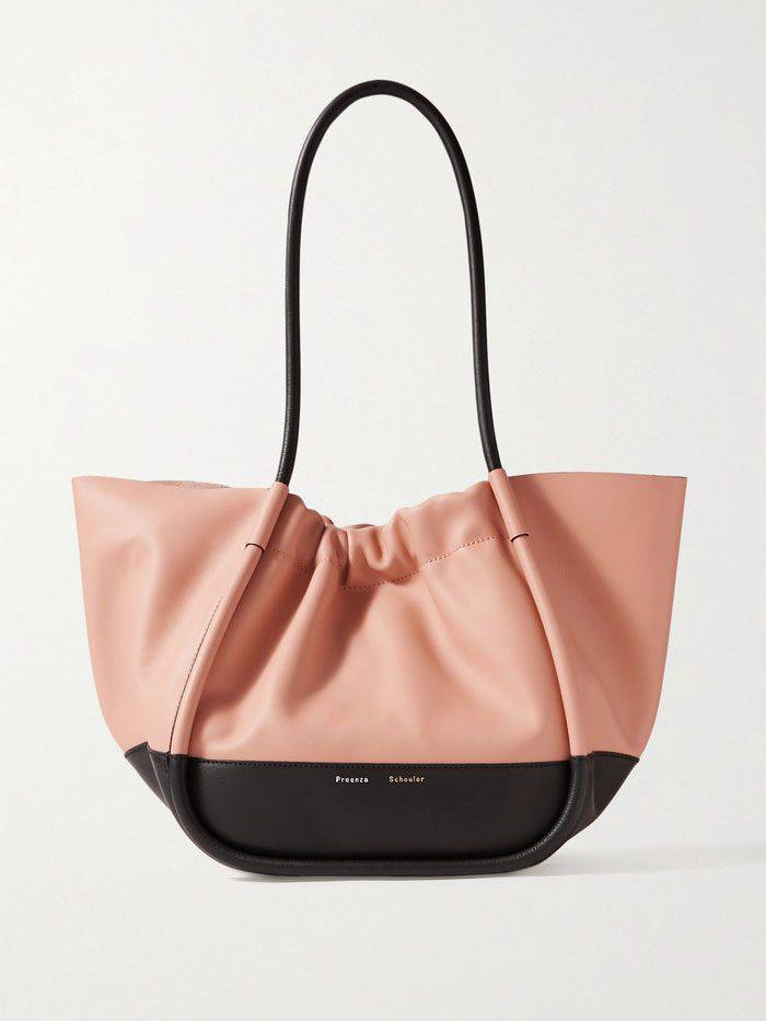 Versatile and roomy enough to fit all of your essentials, making it a great everyday accessory, this bag is crafted in Italy from beige and black leather and has a slouchy silhouette enhanced by ruching at the top.