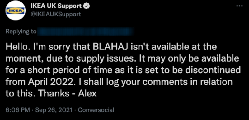 On Sept 28, Ikea Ireland also told a concerned Twitter user that Blahaj is "currently on a supplier delay until mid/end October" and is "due to be discontinued April 2022".