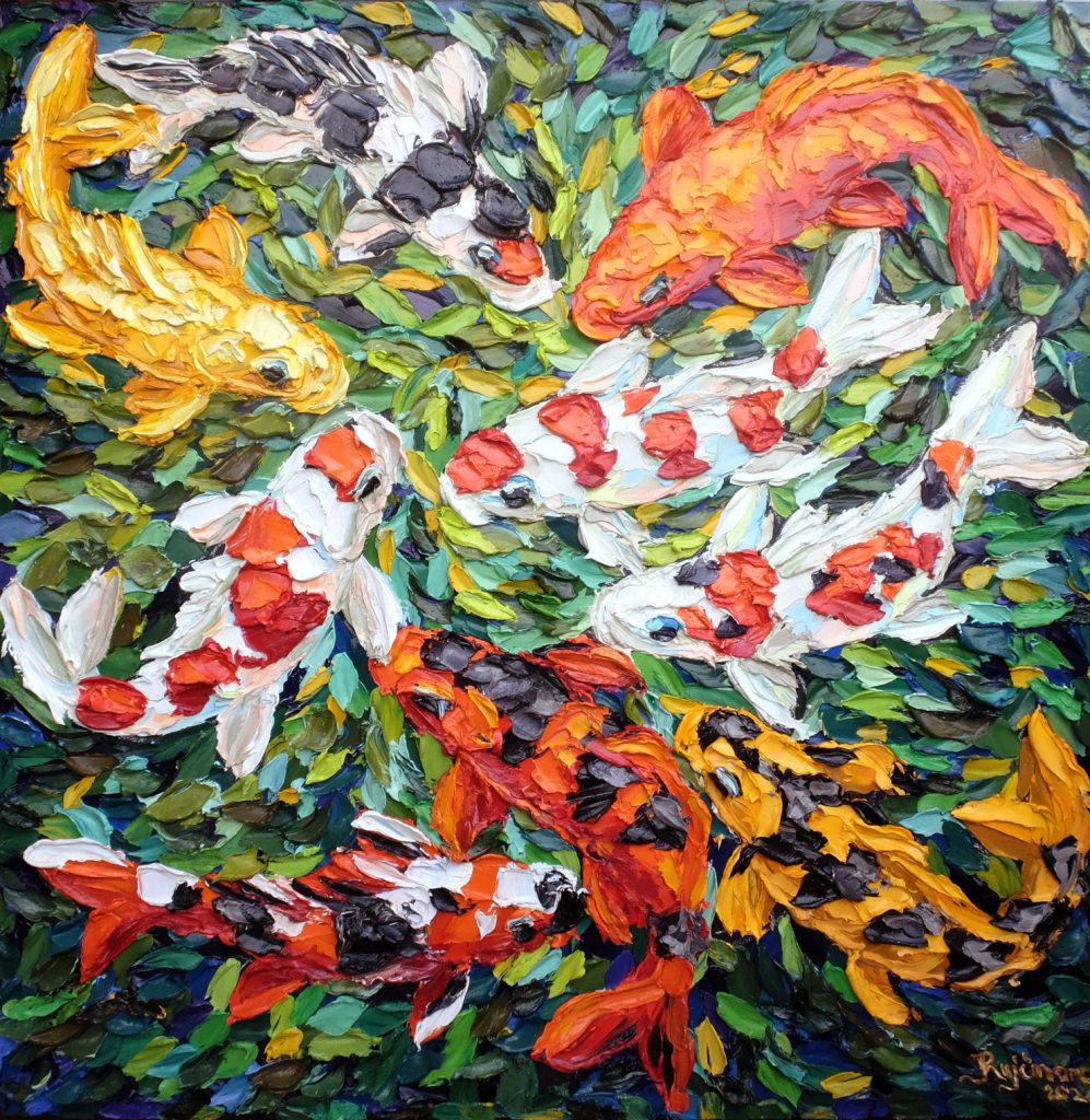 Painted with a palette knife, Indonesian artist Rujiman’s koi paintings are both abstract and striking. The heavy impasto and vibrant colour composition add movement and life to the painting, capturing the movement and texture of the koi.