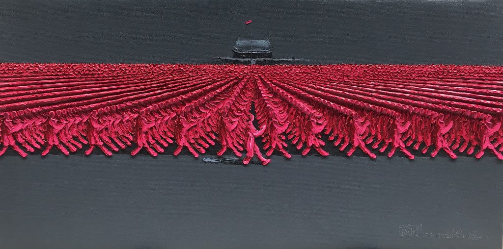 He uses vivid “China Red” to paint the figures practicing Tai Chi, with the colour reflecting a symbolic tribute to Asian culture and values. Through his use of impasto, he created a unique textured surface that illustrates the controlled movements in Tai Chi, and the gracefulness of the martial art form.