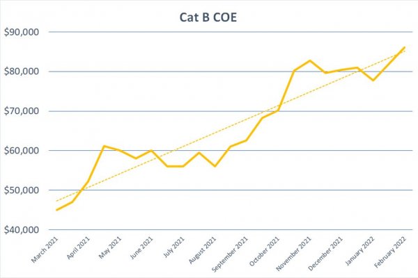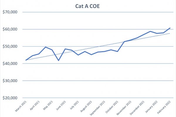 Premiums for Cat A, for cars up to 1,600cc in engine capacity and with an output of no more than 130bhp, rose by $2,863 (4.9 per cent) to end at $60,761 this session.