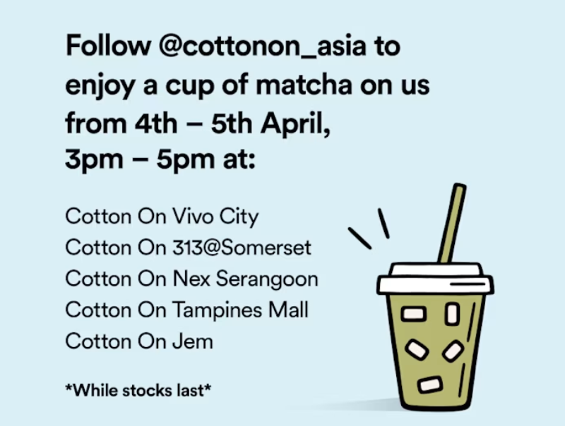 The Instagram account for Cotton On Asia posted on Friday (April 3): "We're not going anywhere! Shop IRL (in real life) and enjoy a free matcha on us."