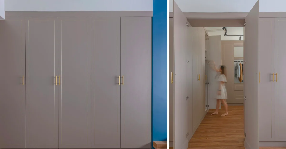 A set of wardrobe doors in their master bedroom hide the entrance to their walk-in wardrobe, which, when opened, leads into a spacious area consisting of more wardrobe and storage spaces.
