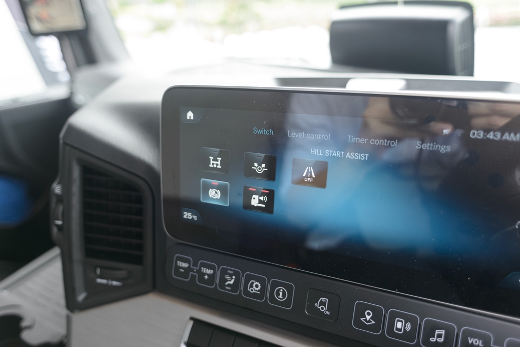 Addressing the big blind spots, on the other hand, is the MirrorCam system. It replaces the typical large wing mirrors found on trucks with a pair of cameras that displays footage on large rectangular screens in the cabin. Without big external mirrors, aerodynamics is improved, and the cameras provide wider viewing angles, too.