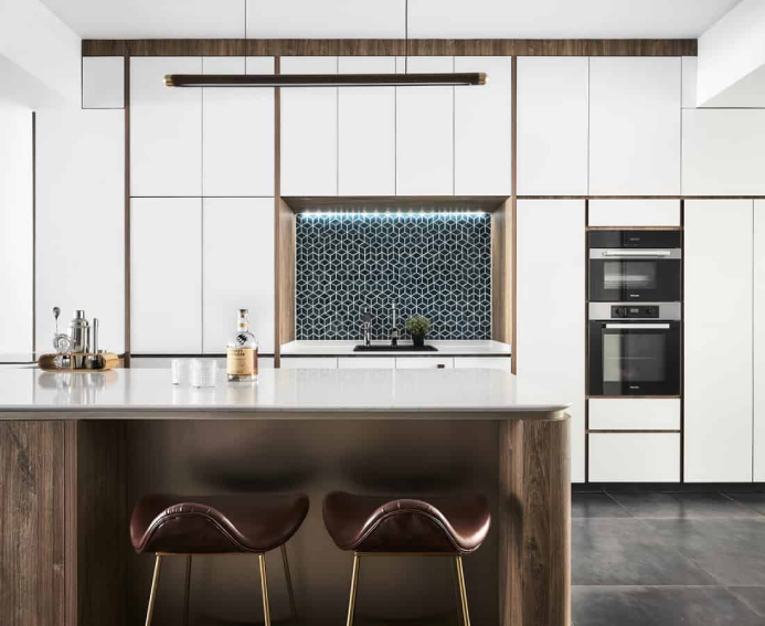 More sleek white cabinets wrap round the open-concept kitchen, cleanly hiding the usual clutter of appliances. Against this sea of white, a handful of Peranakan-inspired details truly pop.
