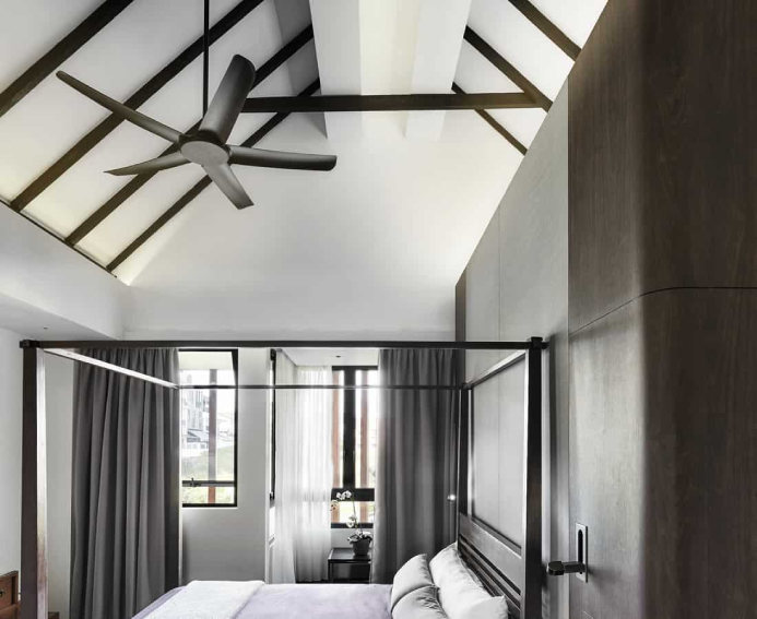 Perched on the highest floor, the bedroom’s false ceiling has been opened up, exposing the dark wood beams of the original truss ceiling – a feature often seen in old shophouses.
