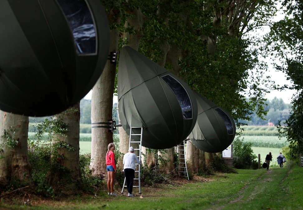 Rather than take a summer holiday abroad during the coronavirus pandemic, some Belgians are trying a novel camping experience at home, spending a night in a teardrop-shaped tent hanging from a tree.