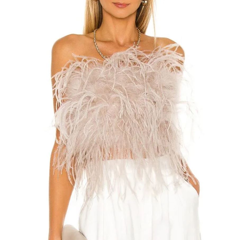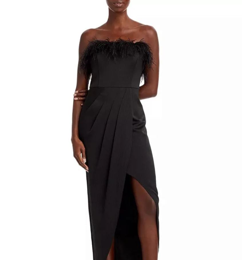 Strapless feather trim gown, $428, Aidan by Aidan Mattox